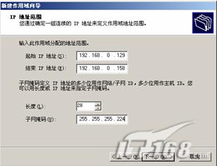 (7)单击“下一步”按钮,打开如图8所示对话框。在这个对话框中要求输入SALES子网的起始和结束IP地址(192.168.0.129~192.168.0.158)。并在下面的“长度”和“子网掩码”项中设置该子网IP地址中用于“网络ID”+“子网ID”的位数和子网的子网掩码。通过前面的配置介绍可知,这个子网中,是用了27位作为网络ID/子网ID的,子网掩码为255.255.255.224。注意,这两项是有关联的,不是随意的,如果配错了,系统会自动修正。