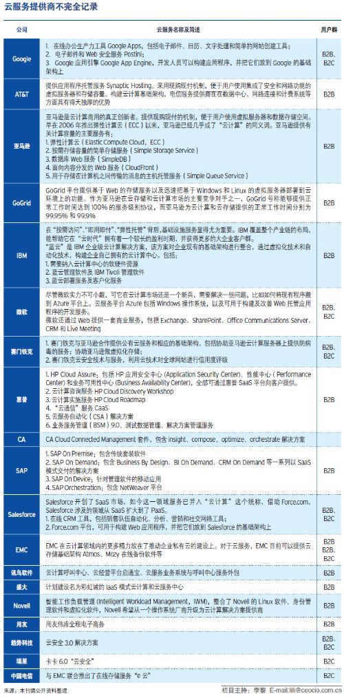而一些传统的软件和互联网公司则要相对轻盈得多,选择也更多样化。比如试图在互联网架构上打造新计算平台“Azure”平移其在PC端优势的微软;为云服务提供商们提供基础构建开发服务的NOVELL;将SaaS与中国国情结合、主打“全程电子商务”应用的用友伟库网;模仿亚马逊,自建云计算和云服务中心“彩虹城”的盛大网络等等。