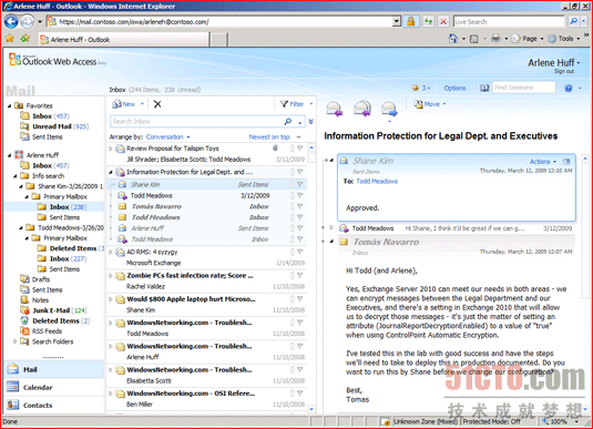 支持多种浏览器(Firefox、Safari和IE)的OWA的是我最推崇的新功能之一。Exchange 2010中的OWA将享有与Outlook 2010桌面端同样的功能。在OWA中甚至可以按权限级别阅读电子邮件,这为远程员工查看敏感信息提供了极大的方便,而不用担心安全性问题。